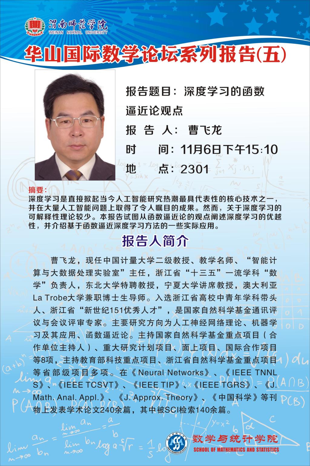 报告人简介:曹飞龙,现任中国计量大学二级教授、教学名师、“智能计算与大数据处理实验室”主任,浙江省“十三五”一流学科“数学”负责人,东北大学特聘教授,宁夏大学讲席教授,澳大利亚La Trobe大学兼职博士生导师。入选浙江省高校中青年学科带头人、浙江省“新世纪151优秀人才”,是国家自然科学基金通讯评议与会议评审专家。主要研究方向为人工神经网络理论、机器学习及其应用、函数逼近论。主持国家自然科学基金重点项目(合作单位主持人)、重大研究计划项目、面上项目、国际合作项目等8项,主持教育部科技重点项目、浙江省自然科学基金重点项目等省部级项目多项。在《Neural Networks》、《IEEE TNNLS》、《IEEE TCSVT》、《IEEE TIP》、《IEEE TGRS》、《J. Math. Anal. Appl.》、《J. Approx. Theory》、《中国科学》等刊物上发表学术论文240余篇,其中被SCI检索140余篇。
