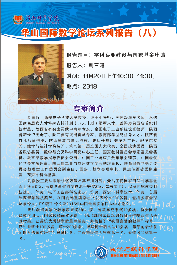 刘三阳,西安电子科技大学教授、博士生导师,国家级教学名师,入选国家高层次人才特殊支持计划领军人才。曾评为陕西省首批科技新星、陕西省有突出贡献中青年专家、全国电子工业系统优秀教师、陕西省新长征突击手、陕西省有突出贡献专家、教育部跨世纪优秀人才、陕西省首批师德楷模、陕西省教书育人楷模。先后任应用数学系主任、理公司经理、bevictor伟德经理、第九第十届全国人大代表、全国政协委员、陕西省政协委员、数学与交叉科学研究中心主任、国家教材委员会专家委员会委员、教育部教学指导委员会委员、中国工业与应用数学学会理事、中国最优化学会常务理事、陕西省工业与应用数学学会副理事长、陕西省教学指导委员会数理类工作委员会副主任、西安市数学会理事长、民进陕西省委副主委、西安市科协常委。
