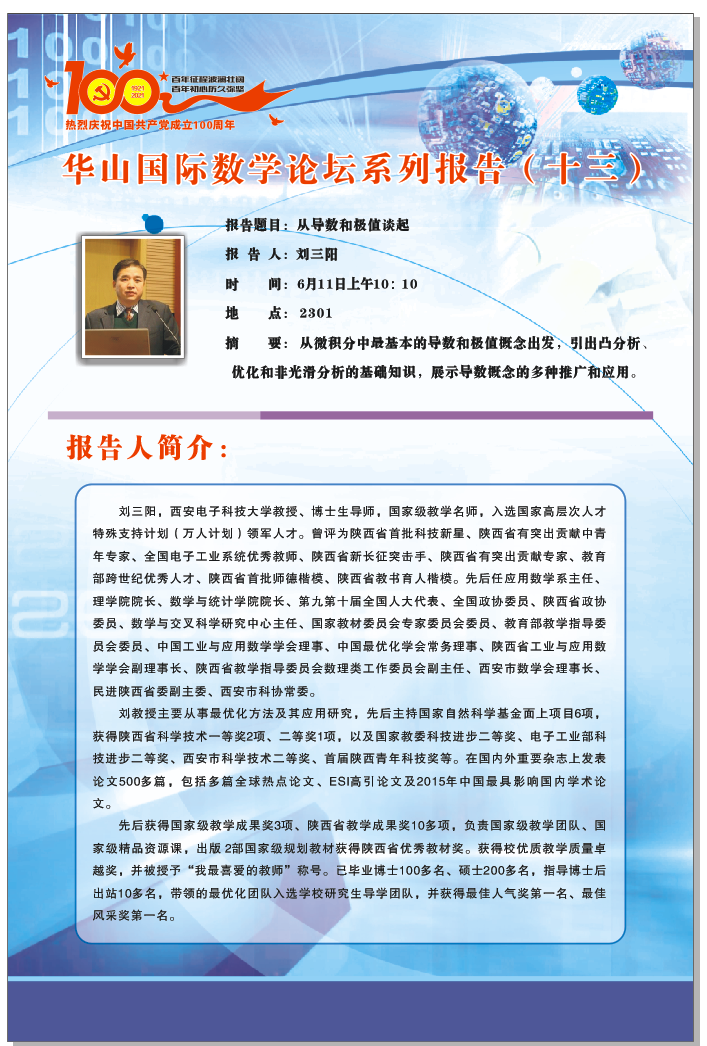 报告人简介:刘三阳,西安电子科技大学教授、博士生导师,国家级教学名师,入选国家高层次人才特殊支持计划领军人才。曾评为陕西省首批科技新星、陕西省有突出贡献中青年专家、全国电子工业系统优秀教师、陕西省新长征突击手、陕西省有突出贡献专家、教育部跨世纪优秀人才、陕西省首批师德楷模、陕西省教书育人楷模。先后任应用数学系主任、理公司经理、bevictor伟德经理、第九第十届全国人大代表、全国政协委员、陕西省政协委员、数学与交叉科学研究中心主任、国家教材委员会专家委员会委员、教育部教学指导委员会委员、中国工业与应用数学学会理事、中国最优化学会常务理事、陕西省工业与应用数学学会副理事长、陕西省教学指导委员会数理类工作委员会副主任、西安市数学会理事长、民进陕西省委副主委、西安市科协常委。