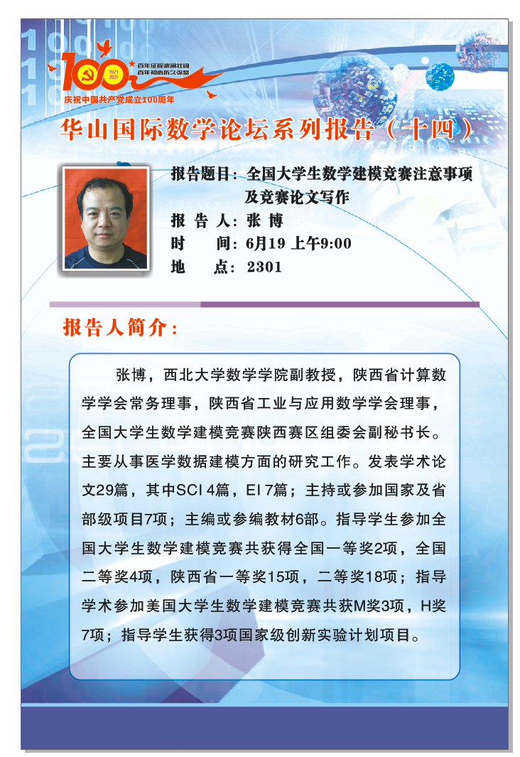 张博,西北大学数学公司副教授,陕西省计算数学学会常务理事,陕西省工业与应用数学学会理事,全国老员工数学建模竞赛陕西赛区组委会副秘书长。主要从事医学数据建模方面的研究工作。发表学术论文29篇,其中SCI 4篇,EI 7篇;主持或参加国家及省部级项目7项;主编或参编教材6部。指导员工参加全国老员工数学建模竞赛共获得全国一等奖2项,全国二等奖4项,陕西省一等奖15项,二等奖18项;指导学术参加美国老员工数学建模竞赛共获M奖3项,H奖7项;指导员工获得3项国家级创新实验计划项目。