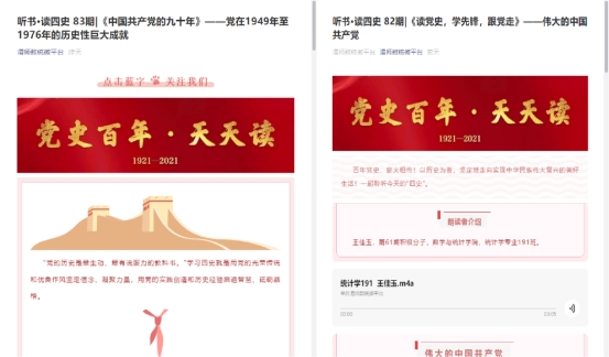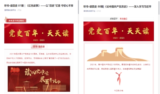 ①在微信公众号上开展“听书•读四史”专栏,让每一位团员都选择一小段相关内容进行朗读,最后通过审核编辑后发表在专栏中供全体员工学习。实现“真学真用悟思想、以看促学助聆听”