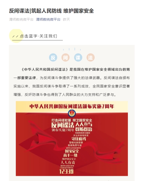 公司微信公众平台在此次活动中,推出了《中华人民共和国反间谍法》和《反间谍安全防范工作规定》相关内容,让广大师生对其有进一步的了解。