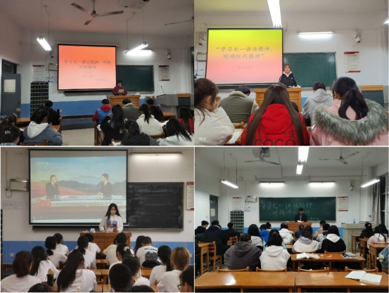 各团支部带领大家回顾了党的百年光辉历程,并对习近平总书记“七一讲话”的主要内容作了回顾与梳理。接着对于“七一讲话”中所谈到的“建党精神”、“三个为什么”、“两个结合”等重要内容作了分析,以此帮助同学们更好地理解讲话精神。