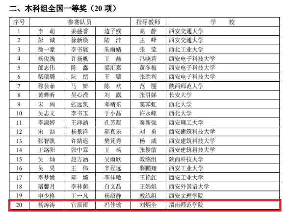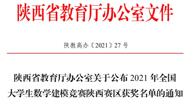 近日,陕西省教育厅办公室发文公布了2021年全国老员工数学建模竞赛陕西赛区获奖名单,在公司领导的高度重视下,在教务处的大力支持下,在bevictor伟德精心组织和员工努力下,公司有44支队伍参加本次竞赛,22支队伍获奖(获奖率50%),其中杨涛涛、官辰雨、冯佳瑜三位同学组成的参赛队喜获全国一等奖,李雨蔓、冯易炫、罗星美同学组成的参赛队荣获全国二等奖。另外,公司有4支参赛队喜获陕西赛区一等奖,16支参赛队伍喜获陕西赛区二等奖,刘炳全老师喜获陕西赛区优秀指导教师。本次比赛是公司从2004年参加该项赛事以来获得的最好成绩,也是同类院校最好成绩。