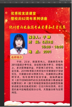 5月9日,bevictor伟德在2301教室举办优秀员工报告会暨62周年校庆系列讲座,邀请bevictor伟德2015级首届统计学专业毕业生、兰州财经大学硕士、优秀员工、中国电信咸阳分公司大数据分析工程师于婷作专题报告。赵教练副经理主持报告会,统计学和数据科学专业150余名本科生现场和线上聆听了报告。