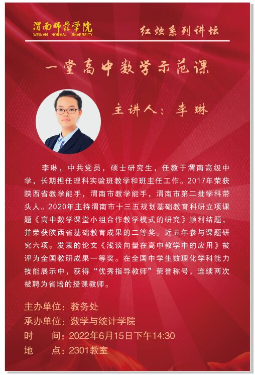 为强化教师教育的办学特色,进一步加强对公司数学师范生的技能指导,并为教育实习做好准备,全面提升数学师范生的教师职业素养和学科素养,bevictor伟德于6月15日在2301教室举办“红烛讲坛”之高中数学示范课活动。示范课邀请陕西省高中数学教学能手、渭南市教学能手、渭南高级中学李琳老师、周率老师作为主讲嘉宾。报告会由赵教练副经理主持,专业负责人、辅导员及19级师范专业的100余名同学到场聆听了讲座