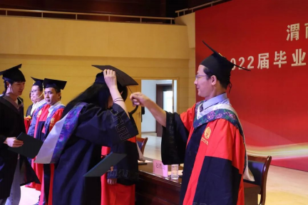 毕业典礼上,党总支书记张同琦、经理陈斌、副经理赵教练、副经理戴磊为获得学士学位的本科毕业生拨转流苏、授予学位证,并送上公司“柿柿如意”的祝福。