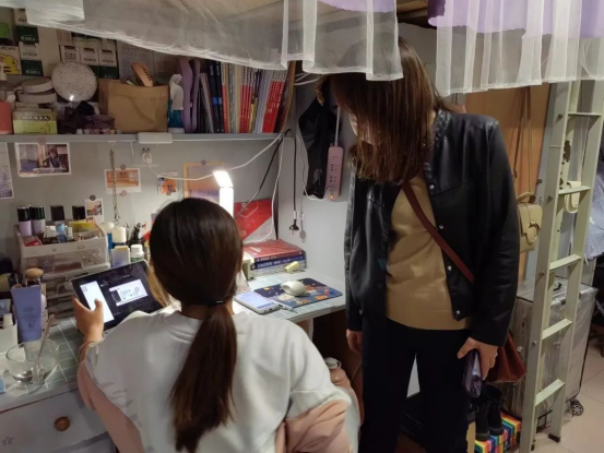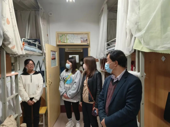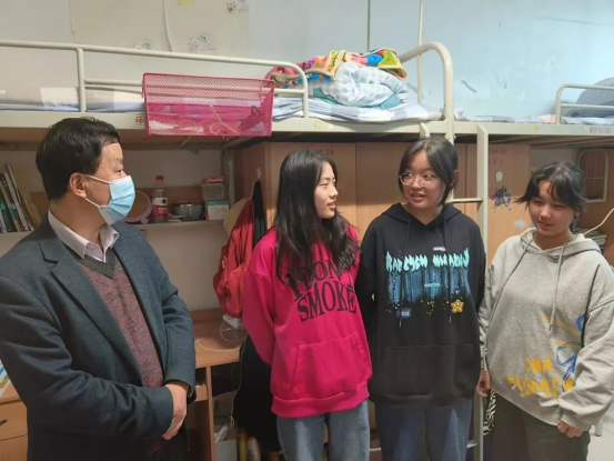 武江波详细询问各公寓的疫情防控工作及核酸检测情况,了解同学们对线上学习形式的适应情况以及当中存在的问题。面对领导的关心,同学们积极地反应存在的问题,感受到如家般的温暖。随后,张菊梅鼓励同学们在线上上课期间调整好状态,做好科学防护的同时安排好个人学习生活,保证良好的精神面貌。