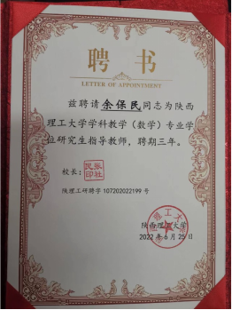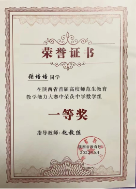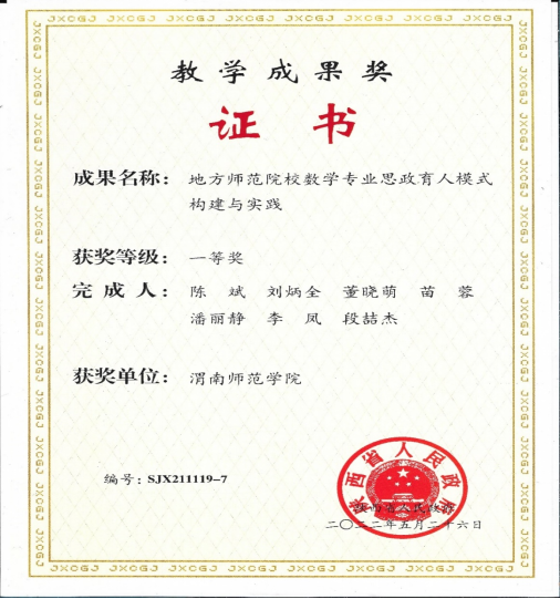 壬寅2022年,学经理期坚持三全育人与思政育人改革与实践,探索专业思政育人新模式,陈斌教授团队主持申报的“地方师范院校数学专业思政育人模式构建与实践”获得了陕西省高等公司教学成果一等奖,实现了公司省级教学成果奖零的突破和公司近年来省级教学成果一等奖新突破,人才培养特色和优势得到社会的认可和好评,人才培养质量不断提升。