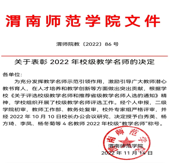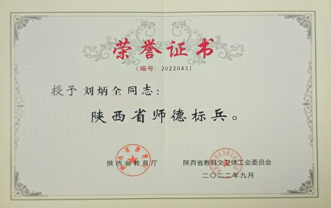 壬寅2022年,学经理期坚持名师楷模和师德师风引领,落实铸魂育人工程,让师德修养和师德传承永流传,引导和教育全体师生,特别是师范生忠诚教育事业,坚守立德树人初心使命。刘炳全教授被评为陕西省师德标兵,李凤副教授被评为陕西省五一巾帼标兵和公司教学名师,张永红副教授被评为公司教书育人楷模,苗蓉副教授被评为公司最美教师。