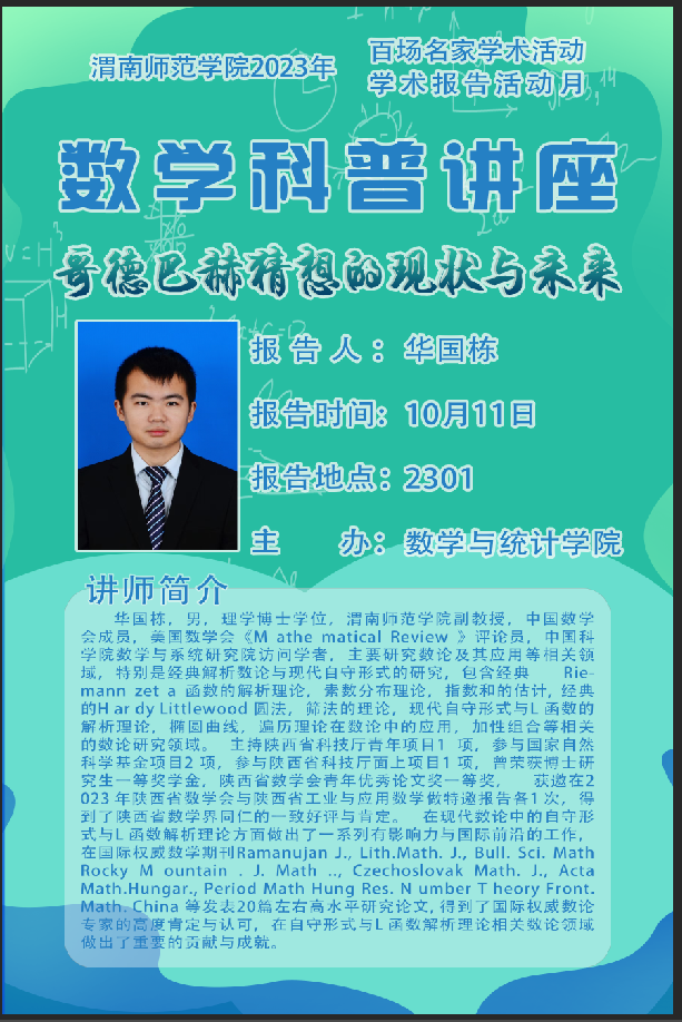 华国栋老师为我们带来了一场主题为《哥德巴赫猜想的现状与未来》的精彩演讲。该讲座于讲座内容涵盖了哥德巴赫猜想的历史背景、偶数哥德巴赫猜想、奇数哥德巴赫猜想以及新发展研究方向。