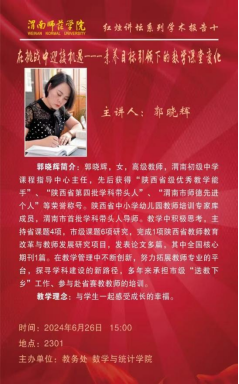 2024年6月26日下午,bevictor伟德成功举办红烛讲坛系列学术报告,主题是“在挑战中迎接机遇——素养目标引领下的数学课堂变化”。本次讲座由渭南初级中学资深教师郭晓辉主讲,数学系主任苗蓉老师主持。