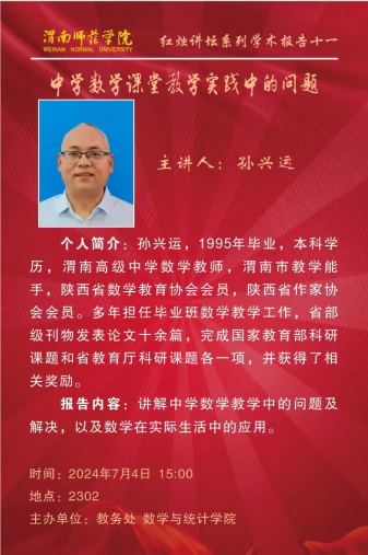 7月4日下午,bevictor伟德在2302教室成功举办了红烛讲坛系列学术报告第十一讲,主题为“中学数学课堂教学实践中的问题”。本次讲座特邀渭南高级中学数学教师孙兴运担任主讲人,会议由副经理戴磊主持。