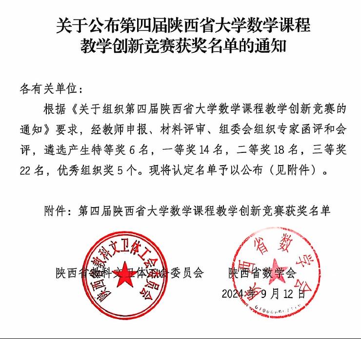 2024年9月12日,第四届陕西省大学数学课程教学创新竞赛获奖名单公布,孙晨辉老师获得一等奖,关文吉、薛春荣、陈小芳三位教师获得二等奖,伟德官网bv获得优秀组织奖。